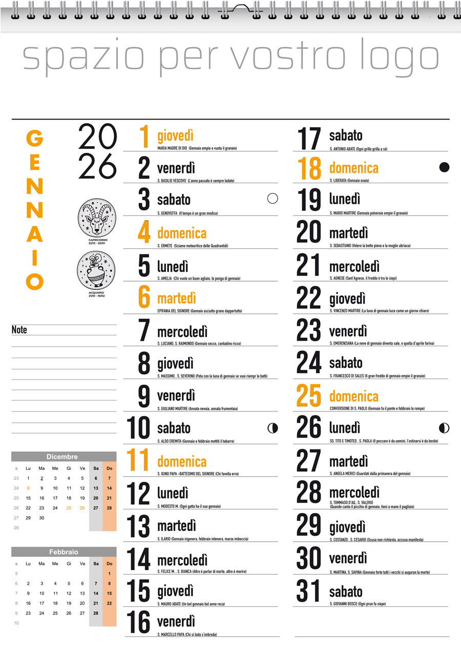 Rilegatura: a spirale metallica con gancio per appendere il calendario al muro.