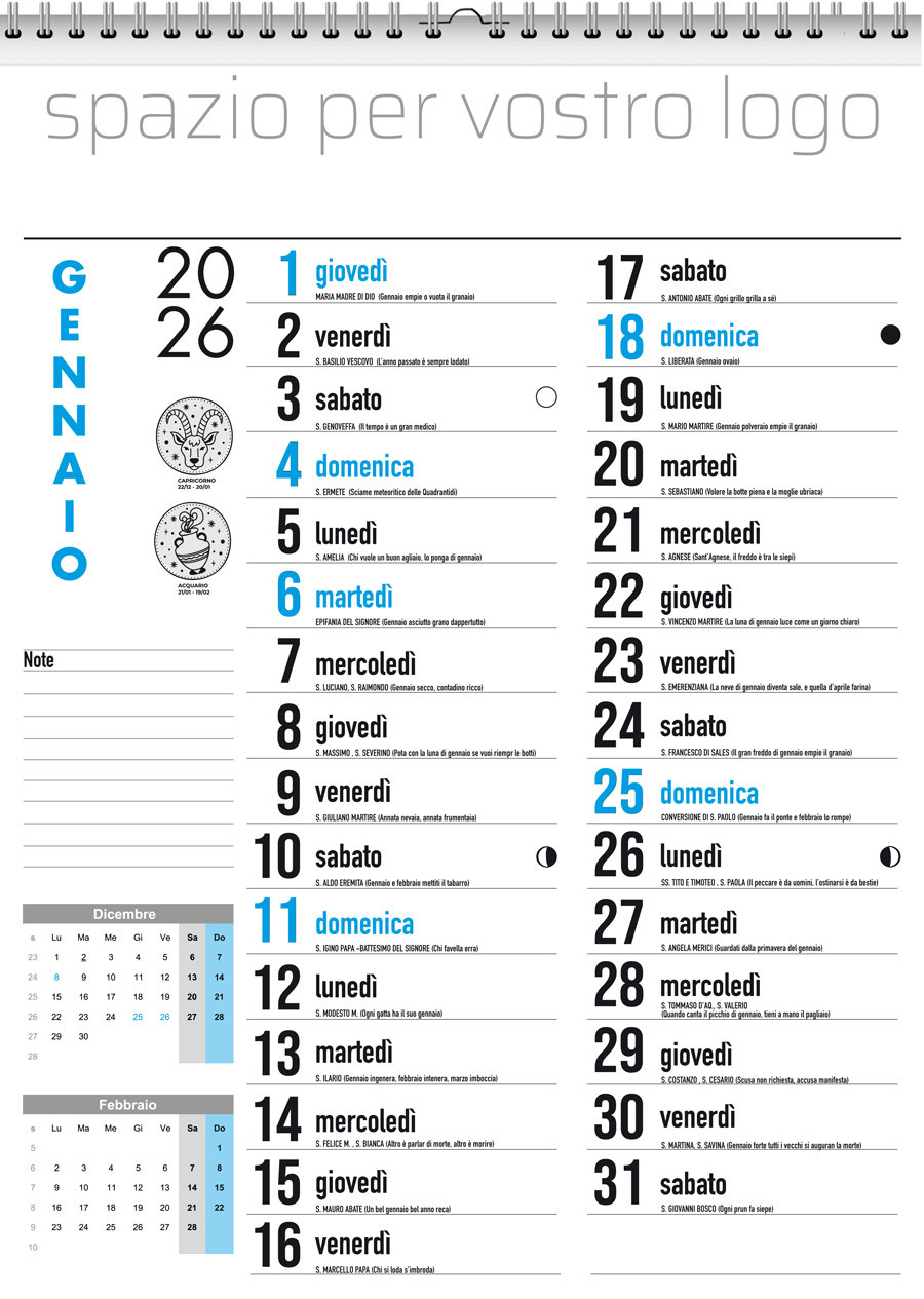Sono composti da 12 fogli, personalizzabili con il vostro logo ripetuto in ogni mese.